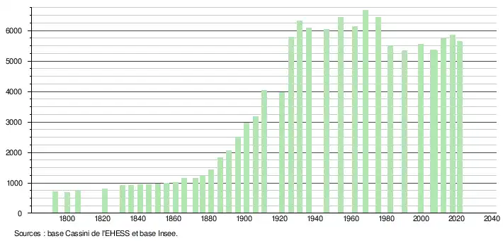 L'évolution du nombre d'habitants est connue à travers les recensements de la population effectués dans la commune depuis 1793. Pour les communes de moins de 10 000 habitants, une enquête de recensement portant sur toute la population est réalisée tous les cinq ans, les populations légales des années intermédiaires étant quant à elles estimées par interpolation ou extrapolation[25]. Pour la commune, le premier recensement exhaustif entrant dans le cadre du nouveau dispositif a été réalisé en 2007[26].