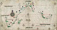 - La France du Moyen Âge sera symbolisée par des pavillons aux armes de France sur les portulans : des navires ont utilisé cet emblème dès 1270 sur un manuscrit[11]. Ainsi, Les armes d'azur semé de fleur de lys d'or et d'azur à trois fleurs de lys d'or sont si étroitement liées à la monarchie française que la langue du blason utilise les expressions de France ancien (pour le semé) et de France moderne (pour les trois fleurs de lys) pour économiser une description archi-connue de tous. On trouve notamment le chef de France (suivant les époques et les villes, de France ancien ou de France moderne) souvent accordé en augmentation par les rois de France à des villes « fidèles » à la couronne, comme Lyon, Angers, Tours, Poitiers, Fréjus, Le Havre, Laon mais aussi la bande de France ou le chevron de France.