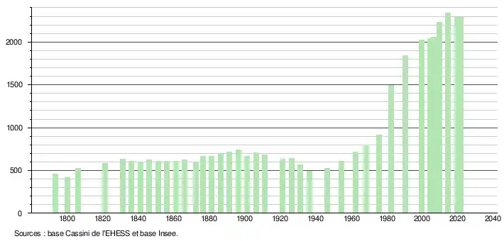 L'évolution du nombre d'habitants est connue à travers les recensements de la population effectués dans la commune depuis 1793. Pour les communes de moins de 10 000 habitants, une enquête de recensement portant sur toute la population est réalisée tous les cinq ans, les populations légales des années intermédiaires étant quant à elles estimées par interpolation ou extrapolation[18]. Pour la commune, le premier recensement exhaustif entrant dans le cadre du nouveau dispositif a été réalisé en 2004[19].