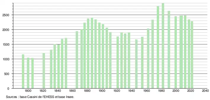 L'évolution du nombre d'habitants est connue à travers les recensements de la population effectués dans la commune depuis 1793. Pour les communes de moins de 10 000 habitants, une enquête de recensement portant sur toute la population est réalisée tous les cinq ans, les populations légales des années intermédiaires étant quant à elles estimées par interpolation ou extrapolation[26]. Pour la commune, le premier recensement exhaustif entrant dans le cadre du nouveau dispositif a été réalisé en 2007[27].
