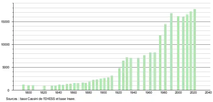 - Par convention dans Wikipédia, le principe a été retenu de n’afficher dans le tableau des recensements et le graphique, pour les populations légales postérieures à 1999, que les populations correspondant à une enquête exhaustive de recensement pour les communes de moins de 10 000 habitants, et que les populations des années 2006, 2011, 2016, etc. pour les communes de plus de 10 000 habitants, ainsi que la dernière population légale publiée par l’Insee pour l'ensemble des communes.