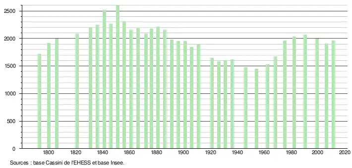 L'évolution du nombre d'habitants est connue à travers les recensements de la population effectués dans la commune depuis 1793. À partir du , les populations légales des communes sont publiées annuellement dans le cadre d'un recensement qui repose désormais sur une collecte d'information annuelle, concernant successivement tous les territoires communaux au cours d'une période de cinq ans. Pour les communes de moins de 10 000 habitants, une enquête de recensement portant sur toute la population est réalisée tous les cinq ans, les populations légales des années intermédiaires étant quant à elles estimées par interpolation ou extrapolation[14]. Pour la commune, le premier recensement exhaustif entrant dans le cadre du nouveau dispositif a été réalisé en 2006[15],[Note 1].