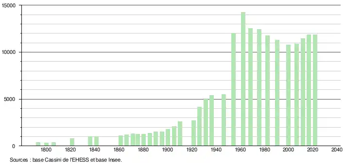 - Par convention dans Wikipédia, le principe a été retenu de n’afficher dans le tableau des recensements et le graphique, pour les populations légales postérieures à 1999, que les populations correspondant à une enquête exhaustive de recensement pour les communes de moins de 10 000 habitants, et que les populations des années 2006, 2011, 2016, etc. pour les communes de plus de 10 000 habitants, ainsi que la dernière population légale publiée par l’Insee pour l'ensemble des communes.