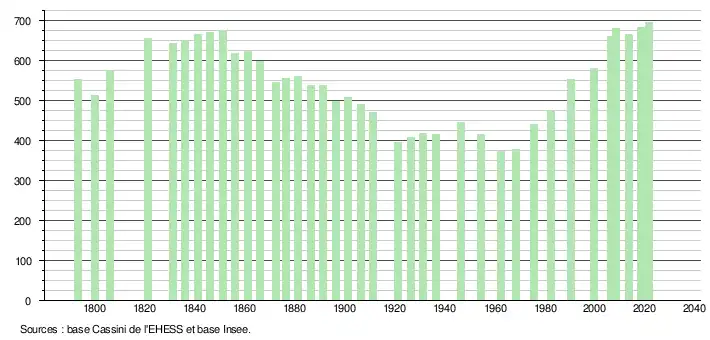 - Population municipale légale en vigueur au 1er janvier 2024, millésimée 2021, définie dans les limites territoriales en vigueur au 1er janvier 2023, date de référence statistique : 1er janvier 2021.