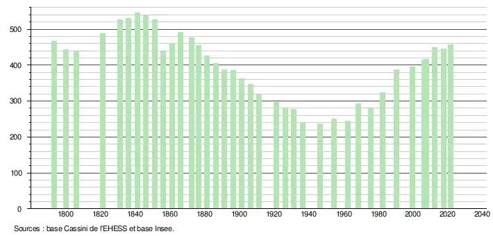 L'évolution du nombre d'habitants est connue à travers les recensements de la population effectués dans la commune depuis 1793. Pour les communes de moins de 10 000 habitants, une enquête de recensement portant sur toute la population est réalisée tous les cinq ans, les populations légales des années intermédiaires étant quant à elles estimées par interpolation ou extrapolation[15]. Pour la commune, le premier recensement exhaustif entrant dans le cadre du nouveau dispositif a été réalisé en 2007[16].