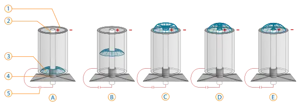 Lorsque la nappe dépasse l'extrémité supérieure de l'anode, sa partie centrale se resserre sous l'effet du champ magnétique jusqu'à former un cordon qui la maintient reliée à l'anode (figures C à E). Cette deuxième phase est qualifiée de phase de compression radiale ou simplement phase radiale.