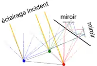 | Principe de la chambre noire : les rayons qui passent par le trou proviennent de différentes directions, donc de différents points de l'objet observé | Chambre noire double avec miroirs : première approche de la focalisation | Focalisation par un miroir courbe : une extension de la chambre noire |