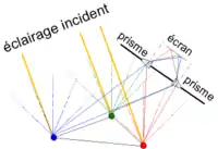 Une des méthodes pour décomposer la lumière consiste à la faire diffracter sur un réseau optique plan (c'est ce phénomène qui donne les irisations sur un disque compact). Un réseau plan consiste en de nombreuses lignes parallèles espacées uniformément, chaque ligne diffusant la lumière dans toutes les directions (contrairement au miroir qui ne réfléchit un rayon donné que dans une seule direction). Les interférences à l'infini (c'est-à-dire loin du réseau) font que seules certaines couleurs ressortent dans certaines directions. Ceci permet d'analyser le spectre de la lumière : on regarde l'intensité de la lumière dans telle ou telle direction, on sait que chaque direction correspond à une longueur d'onde donnée. Notamment, cela permet de caractériser certains phénomènes qui émettent de la lumière. Par exemple, le spectre d'une étincelle faite sur un matériau est caractéristique de la composition chimique du matériau.