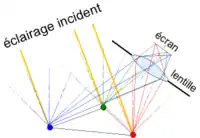Supposons que l'on fasse maintenant deux trous, et qu'un miroir dévie les rayons passant par chaque trou, l'écran se trouvant alors entre les trous. En positionnant bien les miroirs, on peut arriver à faire converger les rayons provenant d'un même point de l'objet observé sur un unique point de l'écran. Ainsi, on aura deux fois plus d'intensité. Par contre, il n'est pas possible de faire converger strictement tous les rayons. Certains points seront légèrement dédoublés, on aura comme deux images légèrement décalées, un flou. On voit donc que la focalisation est un compromis entre l'intensité lumineuse et la netteté.