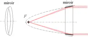 Si maintenant on n'a pas deux points mais toute une ouverture, il faut un miroir courbe correspondant à des petits miroirs plans mis côte-à-côte. Dans ce cas, on focalise des rayons provenant d'un objet proche par un miroir. Pour l'imagerie d'un objet proche, cette situation n'a actuellement que peu d'application concrète, car il faudrait pouvoir déformer le miroir pour s'adapter à la position de l'objet, et notamment à sa distance de l'objectif (on retrouve le problème du flou). Ce système est toutefois utilisé pour un objet de curiosité vendu dans les magasins de découverte scientifique ou de « farces et attrapes » : il s'agit d'une boîte tapissée d'un miroir courbe sur lequel on pose un objet ; les rayons sont focalisés sur l'ouverture de la boîte, ce qui fait que lorsque l'on regarde le miroir, on a l'impression que l'objet se trouve au-dessus de l'ouverture, suspendu dans le vide, et insaisissable. Par contre, les miroirs courbes sont utilisés pour focaliser les objets situés « à l'infini », par exemple dans les télescopes (voir ci-dessous).