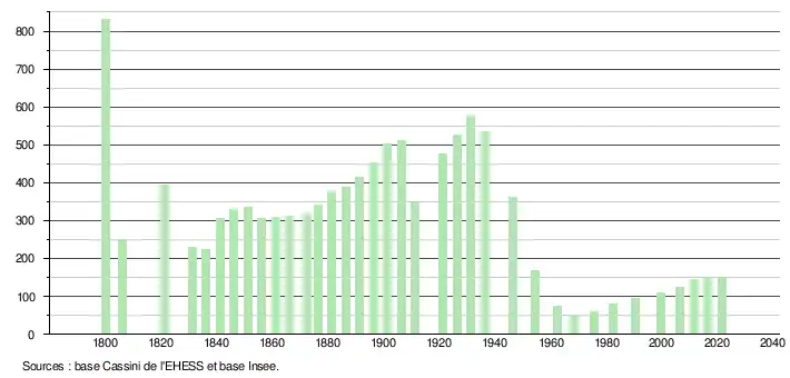 L'évolution du nombre d'habitants est connue à travers les recensements de la population effectués dans la commune depuis 1800. Pour les communes de moins de 10 000 habitants, une enquête de recensement portant sur toute la population est réalisée tous les cinq ans, les populations légales des années intermédiaires étant quant à elles estimées par interpolation ou extrapolation[8]. Pour la commune, le premier recensement exhaustif entrant dans le cadre du nouveau dispositif a été réalisé en 2006[9].