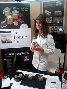 La cheffe Marie-Sophie L. présente sa terrine « la bonne foi » sur un salon alimentaire, en 2018.