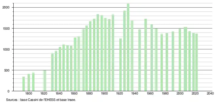 L'évolution du nombre d'habitants est connue à travers les recensements de la population effectués dans la commune depuis 1793. Pour les communes de moins de 10 000 habitants, une enquête de recensement portant sur toute la population est réalisée tous les cinq ans, les populations légales des années intermédiaires étant quant à elles estimées par interpolation ou extrapolation[25]. Pour la commune, le premier recensement exhaustif entrant dans le cadre du nouveau dispositif a été réalisé en 2007[26].