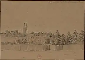 - Le , Beaujon prit un bail à vie sur un terrain de 2 arpents appartenant à Pierre Adrien Lamare, procureur à la prévôté du Roule, pour 450 livres par an[13]. On signale alors sur ce terrain, dont il est indiqué que le locataire pourra faire ce que bon lui semblera, un petit donjon à l'angle de la rue Neuve-de-l'Oratoire projetée et des Champs-Élysées.