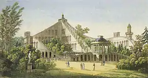 Celui-ci était un édifice simple en profondeur, constitué d'une enfilade de pièces, et élevé de deux étages. L'appartement des bains comprenait une antichambre, un salon, une chambre à coucher en rotonde, un cabinet de toilette et, dans une pièce à côté, une baignoire en cuivre peinte en faux-marbre, avec un dessus-de-baignoire imitant un lit. Les étages comprenaient plusieurs appartements complets.