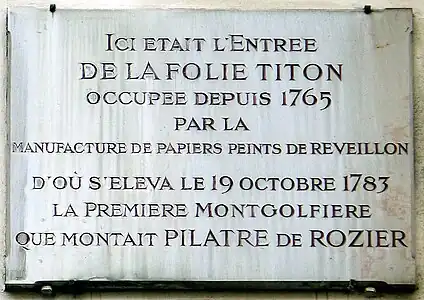 L'aéronaute Pilâtre de Rozier fit les premières expériences des ballons des frères Montgolfier dans les jardins de la folie Titon.