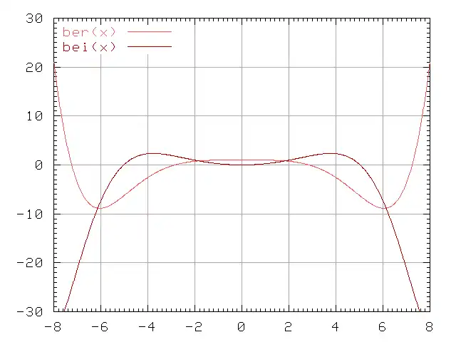 Les fonctions de Kelvin-Bessel d'ordre , plus simplement notées et , sont représentées sur la figure suivante pour les petites valeurs de :