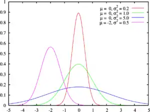 Ainsi, cette intégrale vaut 1 si et seulement si , et alors, la gaussienne a les propriétés d'une densité de probabilité d'une variable aléatoire suivant une loi normale d'espérance μ et de variance σ2. Graphiquement "a" représente l'amplitude de la fonction gaussienne, son ordonnée maximale.
