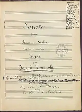 - Dans le coin supérieur apparaissent les noms des violonistes ayant interprété cette sonate: « Laub, Vieuxtemps, Wieniawski, Joachim, Auer, Sarasate, Kontski, Colyns, Sivori, Schradieck, Hubay, Ysaÿe, Gust, Hollaender, Prill, Rémy ».