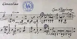 Mais l'autographe le plus exceptionnel conservé dans ce fonds est celui du Concertino pour quatuor à cordes, op. 20 de Stravinsky, dont le Quatuor Pro Arte a donné une première audition en Belgique en 1922. Proche du Belge Paul Collaer[7] qui avait fondé les Concerts Pro Arte en cette même année, le compositeur russe (naturalisé Français en 1934, puis Américain en 1945) a pu bénéficier du support inconditionnel du quatuor pour la diffusion internationale de sa musique.