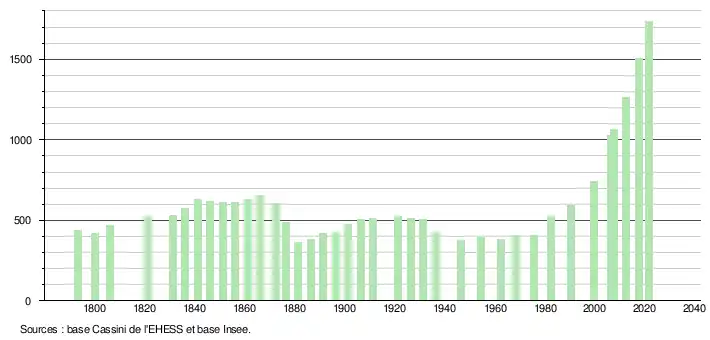 L'évolution du nombre d'habitants est connue à travers les recensements de la population effectués dans la commune depuis 1793. Pour les communes de moins de 10 000 habitants, une enquête de recensement portant sur toute la population est réalisée tous les cinq ans, les populations légales des années intermédiaires étant quant à elles estimées par interpolation ou extrapolation[22]. Pour la commune, le premier recensement exhaustif entrant dans le cadre du nouveau dispositif a été réalisé en 2007[23].