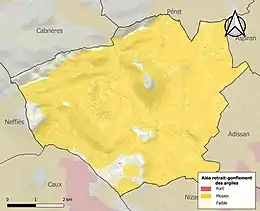 Le retrait-gonflement des sols argileux est susceptible d'engendrer des dommages importants aux bâtiments en cas d’alternance de périodes de sécheresse et de pluie. 88,7 % de la superficie communale est en aléa moyen ou fort (59,3 % au niveau départemental et 48,5 % au niveau national). Sur les 544 bâtiments dénombrés sur la commune en 2019, 540 sont en aléa moyen ou fort, soit 99 %, à comparer aux 85 % au niveau départemental et 54 % au niveau national. Une cartographie de l'exposition du territoire national au retrait gonflement des sols argileux est disponible sur le site du BRGM[20],[Carte 2].