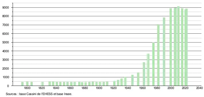 L'évolution du nombre d'habitants est connue à travers les recensements de la population effectués dans la commune depuis 1793. Pour les communes de moins de 10 000 habitants, une enquête de recensement portant sur toute la population est réalisée tous les cinq ans, les populations légales des années intermédiaires étant quant à elles estimées par interpolation ou extrapolation[19]. Pour la commune, le premier recensement exhaustif entrant dans le cadre du nouveau dispositif a été réalisé en 2005[20].