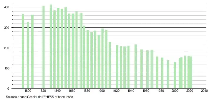 L'évolution du nombre d'habitants est connue à travers les recensements de la population effectués dans la commune depuis 1793. Pour les communes de moins de 10 000 habitants, une enquête de recensement portant sur toute la population est réalisée tous les cinq ans, les populations légales des années intermédiaires étant quant à elles estimées par interpolation ou extrapolation[21]. Pour la commune, le premier recensement exhaustif entrant dans le cadre du nouveau dispositif a été réalisé en 2008[22].