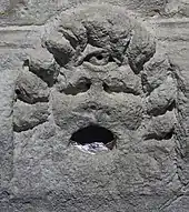 Cette tête en bas-relief est travaillée sommairement, les cheveux forment une épaisse couronne autour du visage. Des stries obliques soulignent les hautes mèches. Les orbites sont creusées et les yeux mi-clos, tandis que l'appendice frontal qui identifie le Cyclope est mis en valeur par sa taille et sa proéminence. Sur cette fontaine, l'image du Cyclope relève de son iconographie traditionnelle dans l'art hellénistique et romain, celle d'un géant humanisé, chevelu et barbu avec des yeux normaux et un troisième sur le front. Si le Cyclope ornant des fontaines est attesté littérairement, la fontaine au Cyclope trouvée à Lyon est un unicum[2]. Son utilisation sur cette fontaine dédiée à Claude peut être une simple évocation de l'eau : Polyphème étant le fils de Poséidon. Mais elle peut également être rapprochée du goût de Claude pour les thèmes odysséens comme l'épisode de l'enivrement de Polyphème par Ulysse[2]. Selon Jean-Jacques Hatt, ce cyclope est inspiré de la mythologie celtique irlandaise et représente le géant Balor vaincu par le dieu Lug[7].