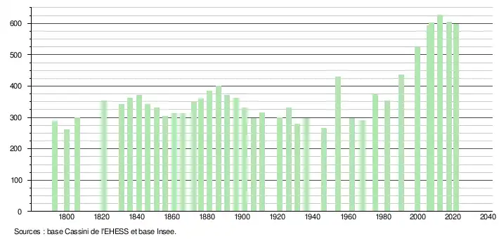L'évolution du nombre d'habitants est connue à travers les recensements de la population effectués dans la commune depuis 1793. Pour les communes de moins de 10 000 habitants, une enquête de recensement portant sur toute la population est réalisée tous les cinq ans, les populations légales des années intermédiaires étant quant à elles estimées par interpolation ou extrapolation[15]. Pour la commune, le premier recensement exhaustif entrant dans le cadre du nouveau dispositif a été réalisé en 2007[16].
