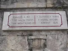 Apposée au dos de la fontaine, une dédicace comporte des noms ainsi que la date de construction.