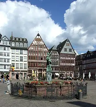 La plus ancienne mention d’une fontaine (flissende borne) est due à l’historien francfortois Achilles Augustus von Lersner. Lersner rapporte, dans sa chronique du début du XVIIIe siècle, l’existence en 1453 d’un circuit de canalisations allant de la porte de Mayence à une fontaine en face de l’ancienne église Saint-Nicolas[2]. La véracité de ce fait est néanmoins déjà réfutée en 1871 par le directeur des archives de Francfort, Georg Ludwig Kriegk. Celui-ci confirme néanmoins que cette même année 1453, le conseil municipal fit nommer une commission pour étudier l’idée de la construction de plusieurs fontaines dans la ville – projet qui ne sera finalement mené à bien qu’en 1944, en raison des coûts de construction[3].