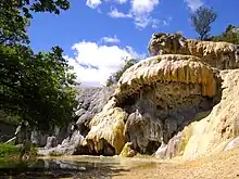 C'est la faille qui favorise la remontée vers la surface où les eaux jaillissent à la température de 21 °C. Elles sont chargées en bicarbonate de calcium et dégazent en libérant du gaz carbonique et en formant un précipité de calcite. À Réotier, le dépôt de calcite est d’environ 140 mg/l, un taux suffisant pour pétrifier tous les matériaux environnants[1].