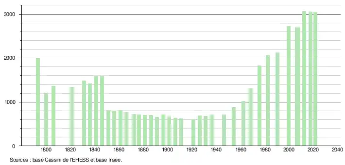 L'évolution du nombre d'habitants est connue à travers les recensements de la population effectués dans la commune depuis 1793. Pour les communes de moins de 10 000 habitants, une enquête de recensement portant sur toute la population est réalisée tous les cinq ans, les populations légales des années intermédiaires étant quant à elles estimées par interpolation ou extrapolation[18]. Pour la commune, le premier recensement exhaustif entrant dans le cadre du nouveau dispositif a été réalisé en 2007[19].