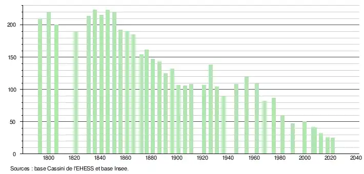 L'évolution du nombre d'habitants est connue à travers les recensements de la population effectués dans la commune depuis 1793. Pour les communes de moins de 10 000 habitants, une enquête de recensement portant sur toute la population est réalisée tous les cinq ans, les populations légales des années intermédiaires étant quant à elles estimées par interpolation ou extrapolation[14]. Pour la commune, le premier recensement exhaustif entrant dans le cadre du nouveau dispositif a été réalisé en 2007[15].