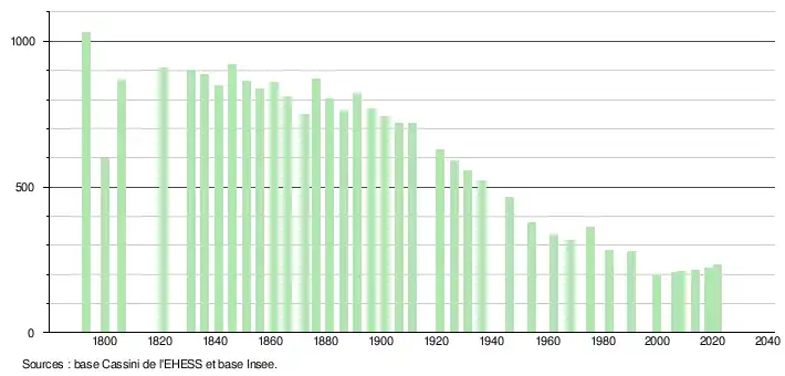 L'évolution du nombre d'habitants est connue à travers les recensements de la population effectués dans la commune depuis 1793. Pour les communes de moins de 10 000 habitants, une enquête de recensement portant sur toute la population est réalisée tous les cinq ans, les populations légales des années intermédiaires étant quant à elles estimées par interpolation ou extrapolation[27]. Pour la commune, le premier recensement exhaustif entrant dans le cadre du nouveau dispositif a été réalisé en 2008[28].
