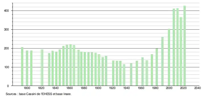 L'évolution du nombre d'habitants est connue à travers les recensements de la population effectués dans la commune depuis 1793. Pour les communes de moins de 10 000 habitants, une enquête de recensement portant sur toute la population est réalisée tous les cinq ans, les populations légales des années intermédiaires étant quant à elles estimées par interpolation ou extrapolation[29]. Pour la commune, le premier recensement exhaustif entrant dans le cadre du nouveau dispositif a été réalisé en 2006[30].