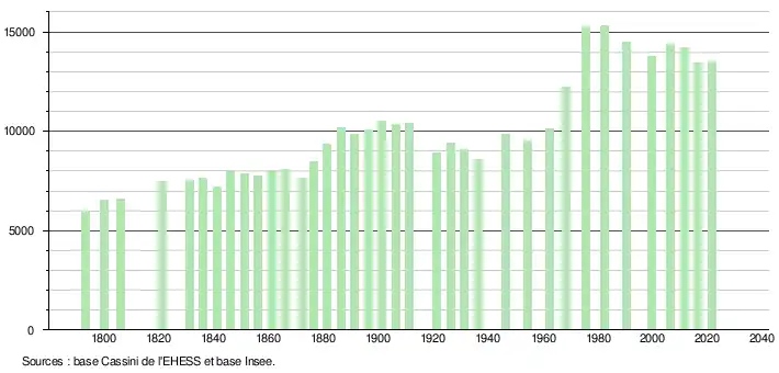 - Par convention dans Wikipédia, le principe a été retenu de n’afficher dans le tableau des recensements et le graphique, pour les populations légales postérieures à 1999, que les populations correspondant à une enquête exhaustive de recensement pour les communes de moins de 10 000 habitants, et que les populations des années 2006, 2011, 2016, etc. pour les communes de plus de 10 000 habitants, ainsi que la dernière population légale publiée par l’Insee pour l'ensemble des communes.