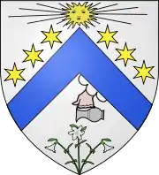 Commentaires : Blason adopté par délibération du Conseil municipal en 1927. Il existe d'autres blasonnements : De sable, tranché d'argent ; à une fontaine d'or brochant sur le tout (Malte-Brun, la France illustrée, tome V, 1884) ; aussi D'azur, à une fontaine à bassin d'argent, côtoyée de deux licornes debout d'argent sommées d'or, à une fleur de lys en chef (Malte-Brun, la France illustrée, tome V, 1884). |