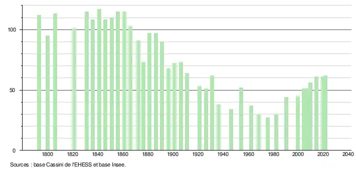 L'évolution du nombre d'habitants est connue à travers les recensements de la population effectués dans la commune depuis 1793. Pour les communes de moins de 10 000 habitants, une enquête de recensement portant sur toute la population est réalisée tous les cinq ans, les populations légales des années intermédiaires étant quant à elles estimées par interpolation ou extrapolation[18]. Pour la commune, le premier recensement exhaustif entrant dans le cadre du nouveau dispositif a été réalisé en 2004[19].