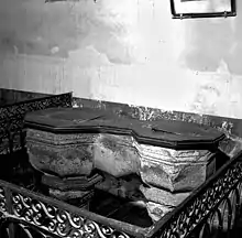 Fonts baptismaux à deux bassins à pans coupés ornés d'une moulure. La plus grande de deux cuves contient l'eau du baptême, l'autre sert aux saintes huiles.