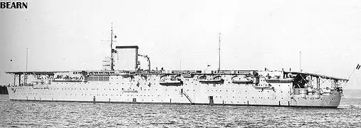 Toutefois, les expérimentations continuent. De 1920 à 1924, une plate-forme est installée sur l'aviso Bapaume, à partir de laquelle est menée une série de décollages de biplans Hanriot HD.12, Nieuport 21 et Nieuport-Delage 32. À la même époque, la société Levasseur commence à produire les premiers bombardiers-torpilleurs susceptibles d'être navalisés, comme le biplan Levasseur PL.2 (dérivé de l'AT.1 terrestre) dont la Marine nationale française commande neuf exemplaires, livrés à partir de 1925. Une nouvelle délégation française se rend au Royaume-Uni, où elle visite notamment l'HMS Argus (I49), un paquebot transatlantique achevé comme porte-avions, la première unité de ce type à disposer d'un pont d'envol continu, et qui embarque vingt aéronefs depuis le . Impressionnés, les membres de la mission recommandent que la coque du cuirassé Béarn de classe Normandie, inachevée à cause de la guerre, soit mise à disposition de l'aviation d'escadre. Le programme naval du prévoyait deux bâtiments d'aviation d'escadre et la transformation de deux cuirassés de classe Normandie en porte-avions. Les réalités budgétaires ont raison de cet ambitieux projet, et il est décidé de doter seulement le Béarn d'un hangar de 100 × 30 m et d'un pont d'envol de 180 m de long. Le lancement du porte-avions « expérimental » Béarn a lieu à La Seyne-sur-Mer le et, du au printemps 1921, a lieu une série de décollages, tout d'abord celui du lieutenant de vaisseau Paul Teste aux commandes d'un Hanriot, puis de Sopwith 1A2, Hanriot HD.2 et Hanriot HD.3. La loi-programme du décide sa transformation en « bâtiment porte-avions d'escadre », en application du traité naval de Washington, qui limite les armements maritimes de ses cinq signataires : les États-Unis, le Royaume-Uni, le Japon la France et l'Italie. La France est mécontente du traité, déclarant qu'elle a droit à une flotte plus grande que celle de l'Italie, puisque devant maintenir une flotte à la fois dans l'Atlantique et la Méditerranée. Contrairement à l'US Navy et la Royal Navy, la Marine nationale française ne précipite pas pour autant la modification du Béarn : du contrat, signé le , au commissionnement, le , il s'écoule cinq ans durant lesquels la Marine nationale se contente de quelques hydravions. Pendant ce temps-là, au début 1925, les essais d'un bombardier-torpilleur Farman F.60 Goliath sont menés à nouveau sur une plate-forme installée au-dessus d'une tourelle du cuirassé Provence. Au même moment commencent à être livrés les Levasseur PL.4, premiers avions français construits en série pour opérer depuis un porte-avions, tandis que le a lieu le premier appontage à la mer (et le premier nocturne), avec la mise en service du Béarn. Ces bombardiers légers biplans forment l'ossature de l'escadrille 7B1, la première à se poser enfin sur le Béarn le , avant d'entamer des manœuvres conjointes avec l'Armée de terre française. Les escadrilles 7C3 et 6C3 sont quant à elles dotées de chasseurs Dewoitine D.1C1. Enfin, la Marine nationale ne se contente pas du Béarn mais équipe d'hydravions d'observation FBA 17 HL1 et HL2 les avisos coloniaux Amiral Charner et Rigault de Genouilly, de classe Bougainville, mais aussi le bâtiment de ligne Strasbourg et les croiseurs Tourville, Duguay-Trouin, Lamotte-Picquet et Primauguet de classe Duguay-Trouin. C'est à partir de ce dernier que le lieutenant de vaisseau Louis Demougeot effectue le premier catapultage de la Marine nationale, le . Fabriquée par les chantiers de Penhoët (Saint-Nazaire), cette catapulte à air comprimé propulse l'avion à 22 m/s. Le premier catapultage par un engin à poudre a lieu en à partir du croiseur lourd Duquesne.