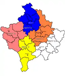 La KFor est divisée en cinq forces opérationnelles qui s'occupent chacune d'une partie du Kosovo et comprend également une unité de carabiniers et de gendarmerie, appelée MSU. L'une de ces forces opérationnelles, la Task force multinationale Nord (cf. carte), englobant la ville (hautement symbolique) de Mitrovica, était sous commandement français jusqu'au retrait de ce pays en 2014.