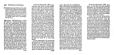 En 1686 (année où est publié l'exposé de sa théorie de l'intégration) Leibniz le rend publique dans un article provocateur[28], qui attaquait le principe de conservation de la quantité de mouvement de Descartes[29] et donc les bases de sa physique. Il procédait à partir du fait admis, y compris par Descartes, qu'il faut la même force pour élever un corps d'un kg à la hauteur de quatre mètres qu'un corps de quatre kg à la hauteur d'un mètre, et donc que s'« il est bien raisonnable que la même force se conserve toujours dans l’univers[30] », dans l'estimation de cette « force motrice », différente de la quantité de mouvement, la vitesse doit intervenir au carré. Par là il introduisait l'exposé de ce qui deviendra la théorie physique de l'activité de la matière.