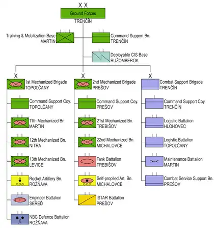 - 1re brigade mécanisée, à Topoľčany (commandant : général 1 étoile)[5]