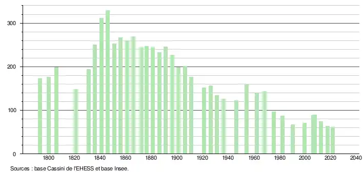 L'évolution du nombre d'habitants est connue à travers les recensements de la population effectués dans la commune depuis 1793. Pour les communes de moins de 10 000 habitants, une enquête de recensement portant sur toute la population est réalisée tous les cinq ans, les populations légales des années intermédiaires étant quant à elles estimées par interpolation ou extrapolation[14]. Pour la commune, le premier recensement exhaustif entrant dans le cadre du nouveau dispositif a été réalisé en 2007[15].