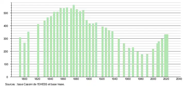L'évolution du nombre d'habitants est connue à travers les recensements de la population effectués dans la commune depuis 1793. Pour les communes de moins de 10 000 habitants, une enquête de recensement portant sur toute la population est réalisée tous les cinq ans, les populations légales des années intermédiaires étant quant à elles estimées par interpolation ou extrapolation[17]. Pour la commune, le premier recensement exhaustif entrant dans le cadre du nouveau dispositif a été réalisé en 2008[18].