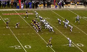 Exemple de formation en I en NFL. Les Steelers de Pittsburgh (noir et jaune) sont en formation en I avec un tight end et deux wide receivers. Les Jets de New York (blanc et vert) sont en défense 4-3.