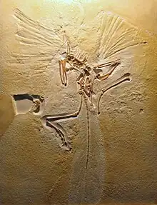 L'un des exemples les plus célèbres de forme transitionnelle est celui de l'Archaeopteryx, la première forme découverte jugée transitionnelle entre dinosaures et oiseaux. Cette espèce présente des caractères dérivés propres aux oiseaux (vol ailé à plumes) et des caractères ancestraux propres aux dinosaures (dents)[18]. Cette mosaïque de caractères a conduit à considérer l'Archéoptéryx comme un chainon manquant entre dinosaures et oiseaux. Comme tous les organismes vivants présentent des mosaïques de caractères ancestraux et de caractères dérivés, les cladistes considèrent que l'Archaeopteryx est une espèce fossile située à l'extrémité d'une branche éteinte. Les évolutionnistes mettent généralement en avant l'absence d'autapomorphie pour défendre sa nature d'espèce ancestrale.