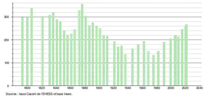 L'évolution du nombre d'habitants est connue à travers les recensements de la population effectués dans la commune depuis 1793. Pour les communes de moins de 10 000 habitants, une enquête de recensement portant sur toute la population est réalisée tous les cinq ans, les populations légales des années intermédiaires étant quant à elles estimées par interpolation ou extrapolation[18]. Pour la commune, le premier recensement exhaustif entrant dans le cadre du nouveau dispositif a été réalisé en 2005[19].